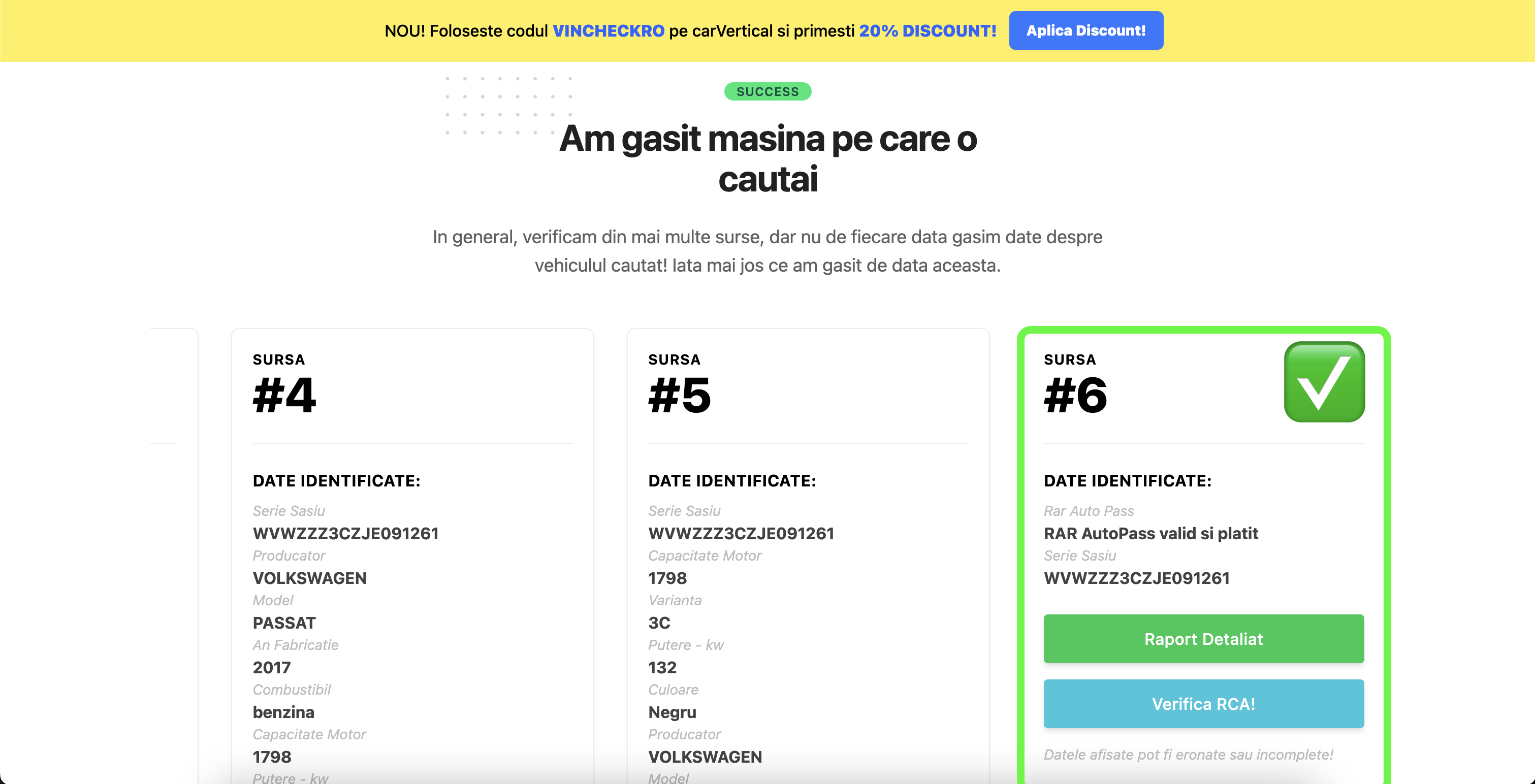 NOU! Foloseste codul VINCHECKRO pe carVertical si primesti 20% DISCOUNT!